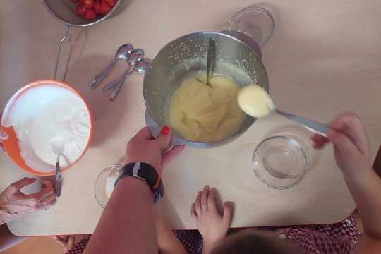 Poté v míse smíchaly jogurt se zakysanou smetanou. Paní učitelka vyšlehala vanilkový pudink.