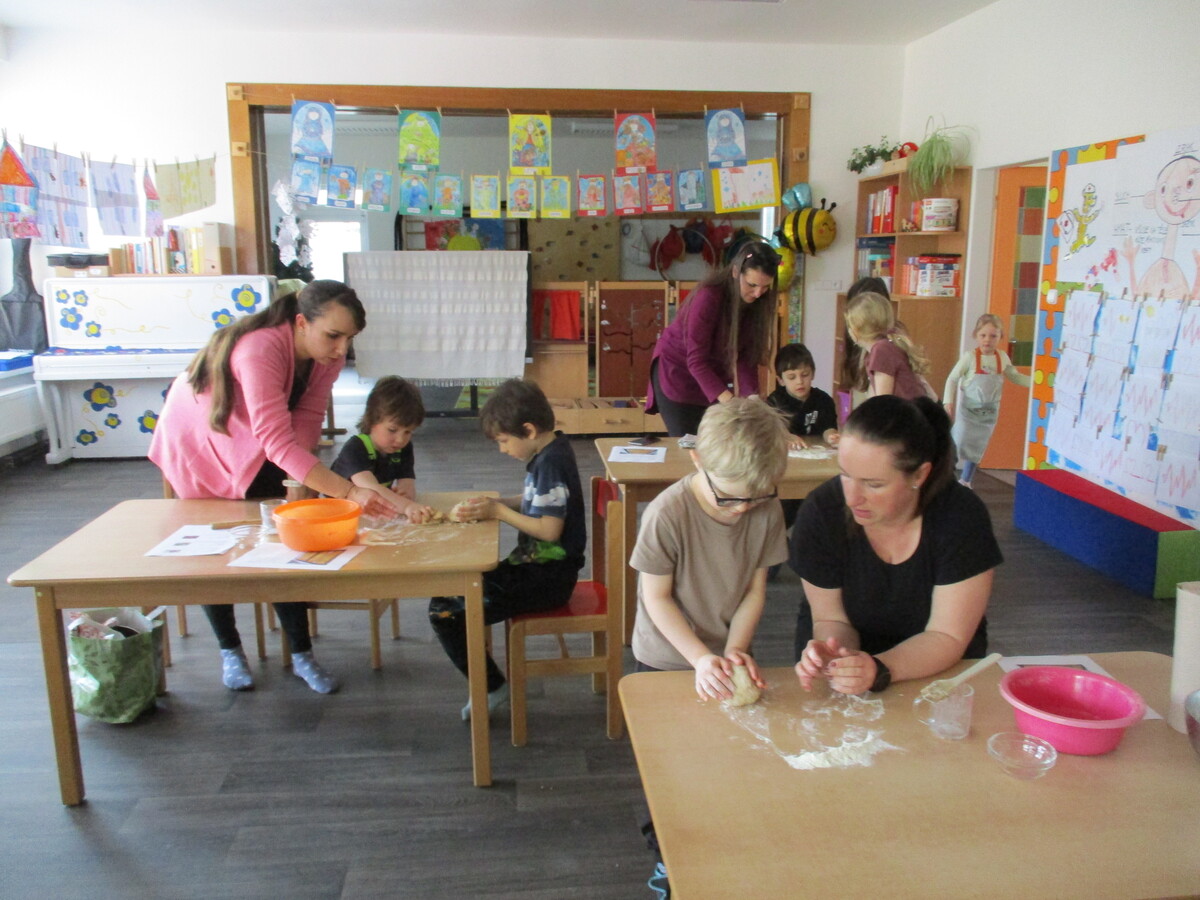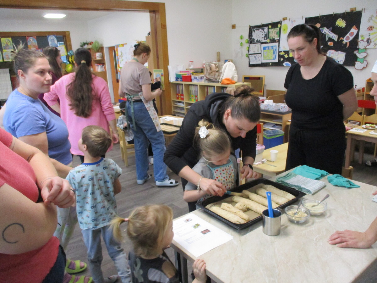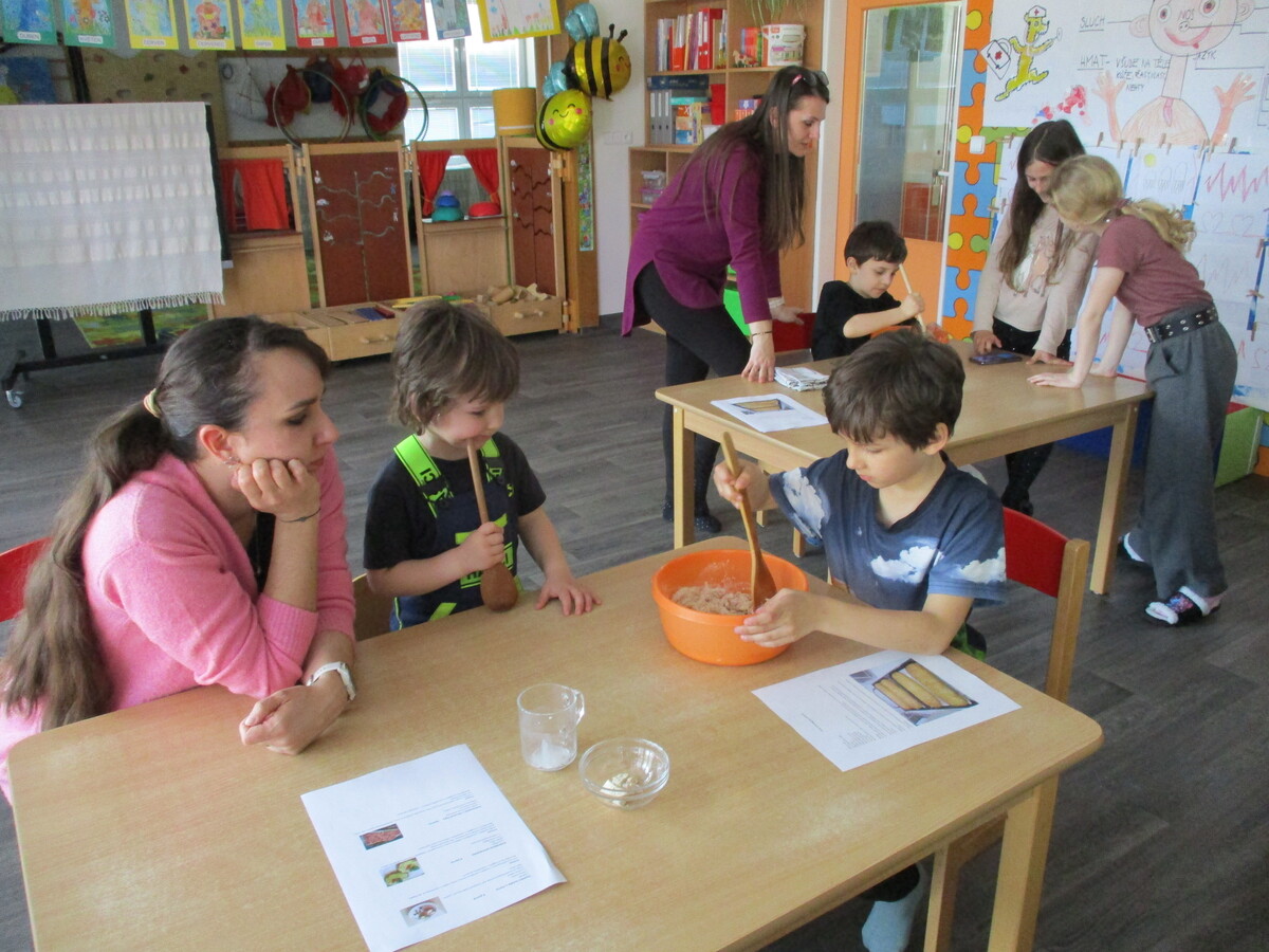 V naší mateřské škole proběhla odpolední akce pro rodiče a děti s názvem Živé vaření. Pod vedením paní kuchařky si všichni připravili několik zdravých a chutných pokrmů. Na jídelníčku byla vícezrnná bageta, avokádová pomazánka, pomazánka z červené řepy a také netradiční cizrnová „nutela“. Děti i rodiče se aktivně zapojili do přípravy, vyzkoušeli si jednoduché postupy a ochutnali výsledky své práce. Akce podpořila nejen spolupráci mezi školou a rodinou, ale také vedla děti k pozitivnímu vztahu ke zdravému stravování.