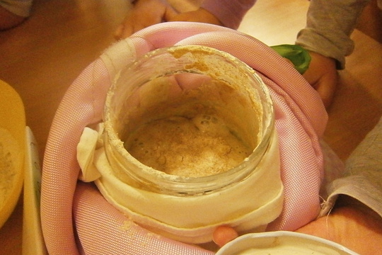 POZOR! Po vykynutí těsta odebereme 2 polévkové lžíce směsi, dáme je do sklenice a uzavřeme víčkem s dírkami. To je „pokračování“ našeho domácího kvásku pro další pečení.