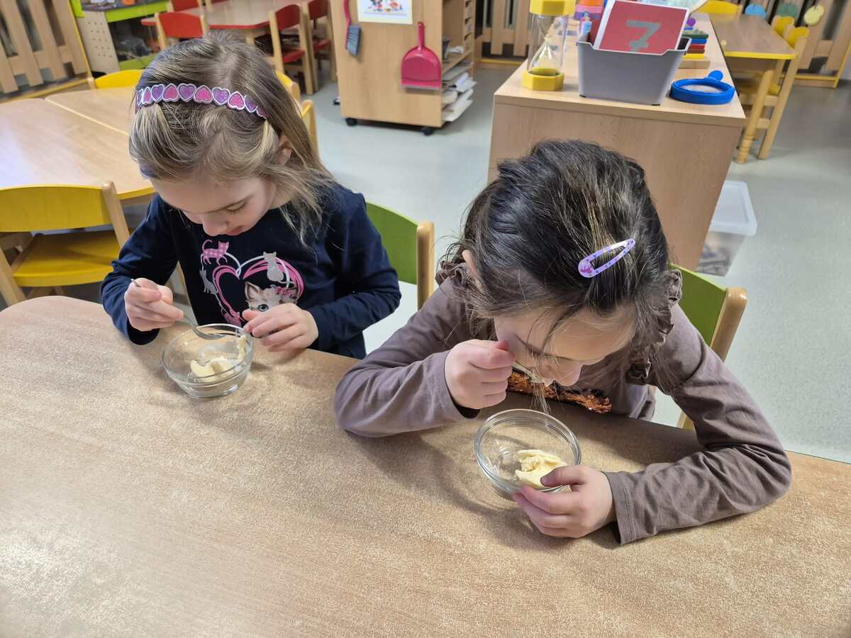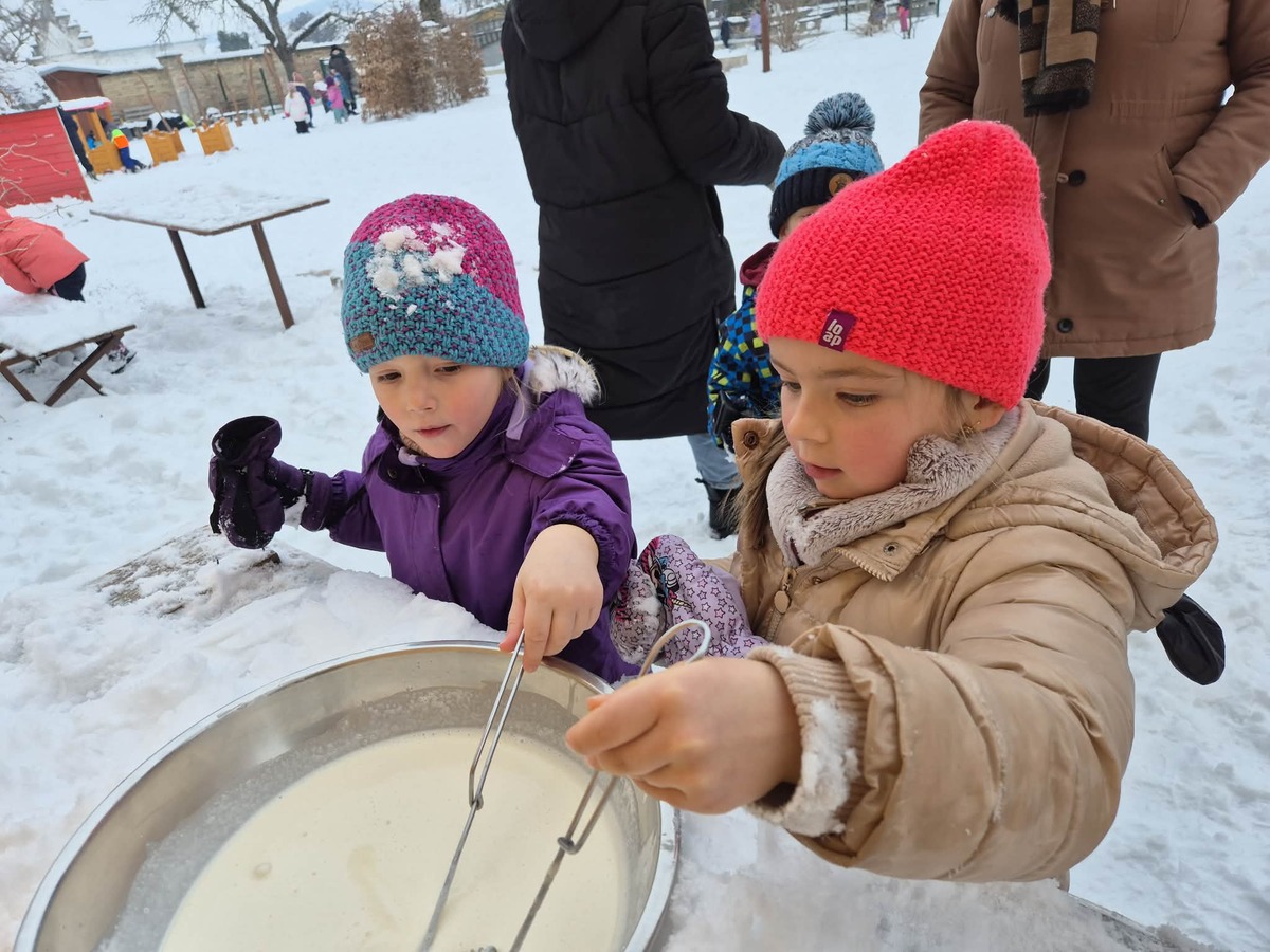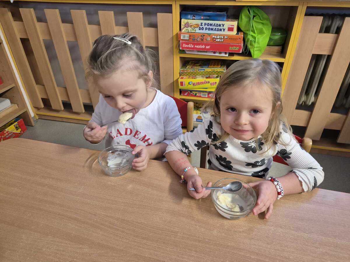 Jednoho sněhového dopoledne se děti pustily do malého experimentu – zkusily připravit domácí zmrzlinu venku ve sněhu. Mráz jim tentokrát posloužil jako přírodní mrazák a děti byly nadšené už od prvního míchání. Základ nám pomohla připravit paní kuchařka, kdy po krátkém povaření vznikl jemný krém, který jsme nechali lehce vychladnout. Venku děti misku postavily přímo do sněhu a občas směs promíchaly. Před očima nám postupně tuhla a měnila se ve zmrzlinu. Byla to zábava, trochu čekání a hodně radosti z obyčejného zimního kouzla. Výsledek? Jednoduchá domácí zmrzlina a krásný společný zážitek, na který budeme dlouho vzpomínat.