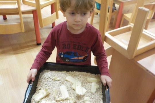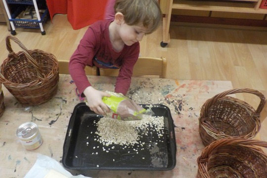 Při tématu "Kdepak ty ptáčku hnízdo máš" si děti povídaly o životě ptáčků v zimě, o tom, jak o ně pečujeme a společně s paní učitelkou vyráběly lojové koule. A když nakrmily ptáčky, tak i sobě upekly domácí müsli.