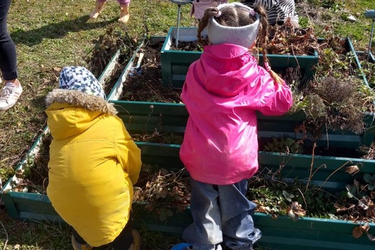 Po vybudování našich záhonů jsme se s dětmi hned vrhli do práce. Děti si záhony zryly, pohrabaly a zasely semínka ředkviček.