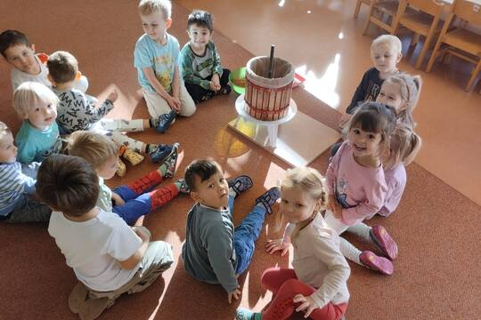 Třída Žabiček zkouší z připravených jablíček lisovat mošt. Děti si práci užívají, sledují, jak z jablek vytéká šťáva, a nakonec všichni ochutnají čerstvý,...
