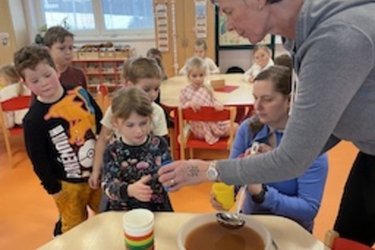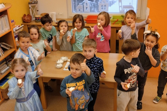 Děti ze třídy Ježečků vymýšlely, co lidem pomáhá snášet chlad a zimu a společně se shodly na tom, že teplé nápoje rozhodně fungují. Z ovoce, ovocných šťáv, džusů...