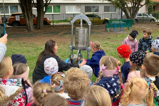 24. 09. 2025Za pomoci rodičů, kteří nám přinesli do školky jablíčka, jsme si s dětmi na zahradě užili krásné moštování. Děti si vyzkoušely, jak se z jablek lisuje mošt, a s...
