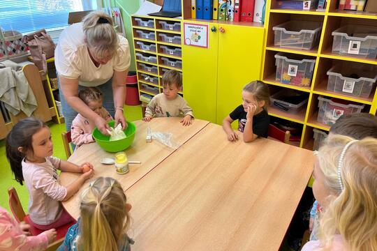 09. 10. 2025Pani kuchařka přišla s dětmi umíchat pomazánku ke svačině. Děti paní kuchařce pomáhaly a pak si pomazánku namazaly na pečivo.